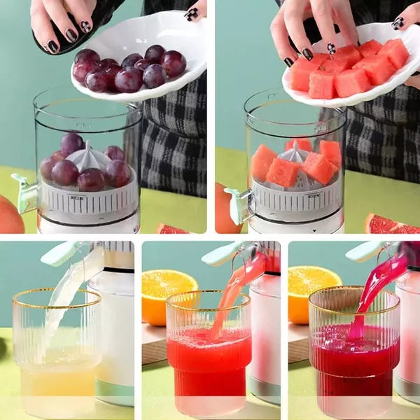 ✨ Diseño práctico y moderno: Compacto, recargable y portátil. Llévalo al trabajo, a un paseo o simplemente úsalo en casa sin ocupar espacio. ¡Exprime directamente en el vaso y disfruta!